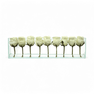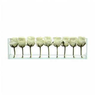 White Roses are the perfect finishing touch to elevate any room. We've imagined a unique spin on the classic bouquet, presenting beautiful close-cropped blooms in a linear display. Each flower is stunningly showcased within a contemporary rectangular glass vase.
