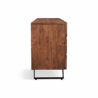 Create your dream bedroom with the exquisite Anaho Dresser. The clean, beveled lines not only give this bureau a neat appearance, but the vivid, acacia brown color adds a distinctive focal point. The entire piece rests on two rectangular, powder-coated metal legs. The traditions of Japanese design are visible in the structure of the Anaho Dresser.