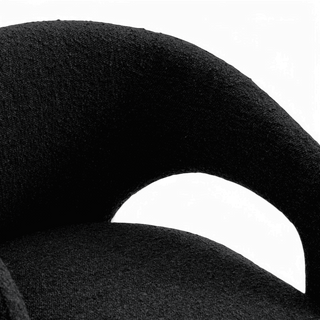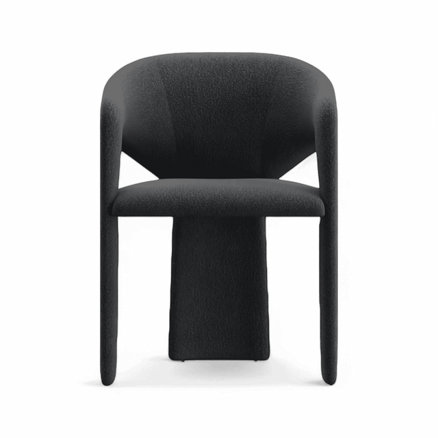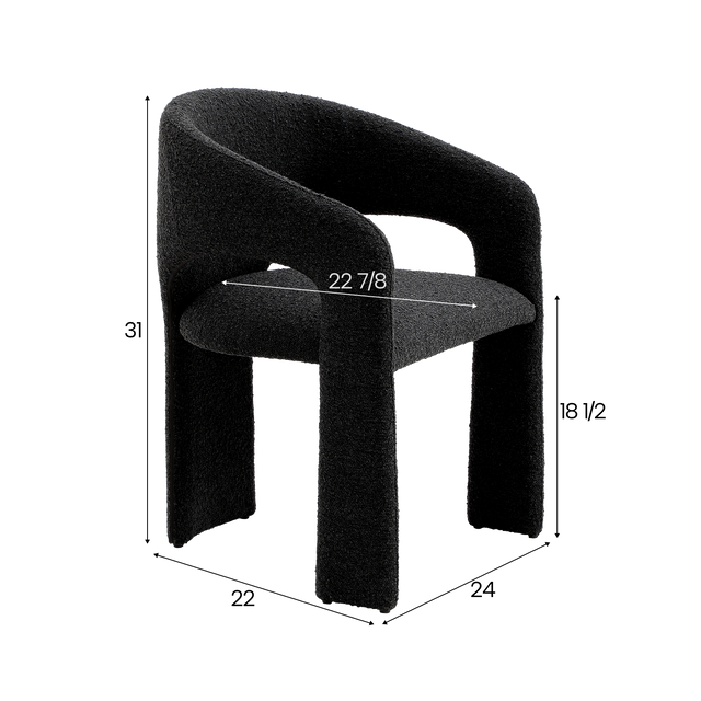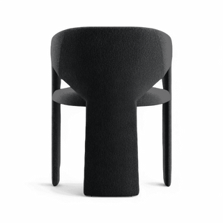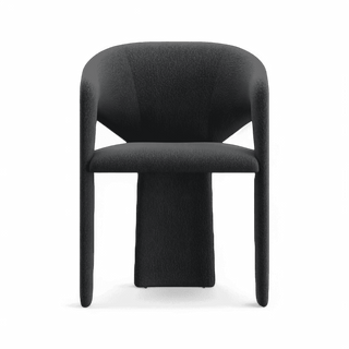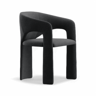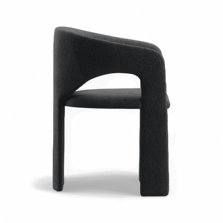 The Aria Dining Chair is a sleek, modern piece that combines contemporary design with functional elegance. Its rounded backrest that cradles the body, offering comfort and style in equal measure. With three subtly tapered legs, the chair boasts a bold silhouette with a larger back leg for added stability. The entire chair is luxuriously upholstered in rich black boucle fabric, providing a soft, textured surface that enhances its sophisticated appeal. Perfect for dining spaces or accent seating, the Aria Dining Chair is a statement of minimalist charm and refined craftsmanship.