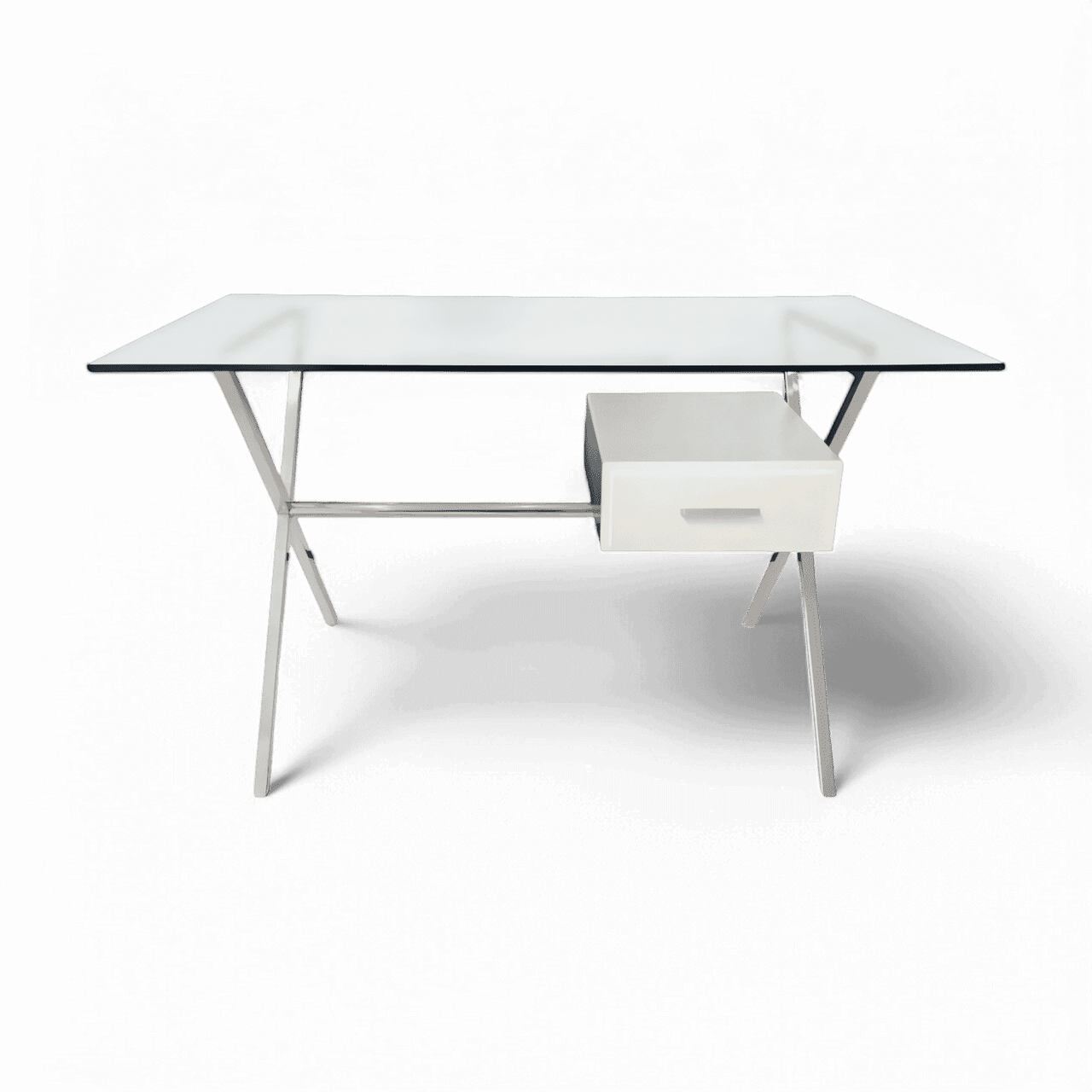 Tempered Glass Top | Polished Stainless Steel Legs | White Drawer | Weight capacity: 110 lbs