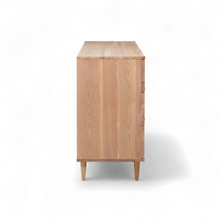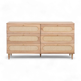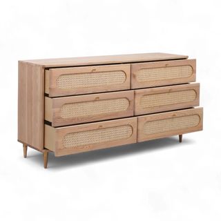 Enhance your bedroom with the Frost Cane 6 Drawer Dresser. Featuring a blend of natural cane detailing and ample storage, it combines beauty and practicality seamlessly.