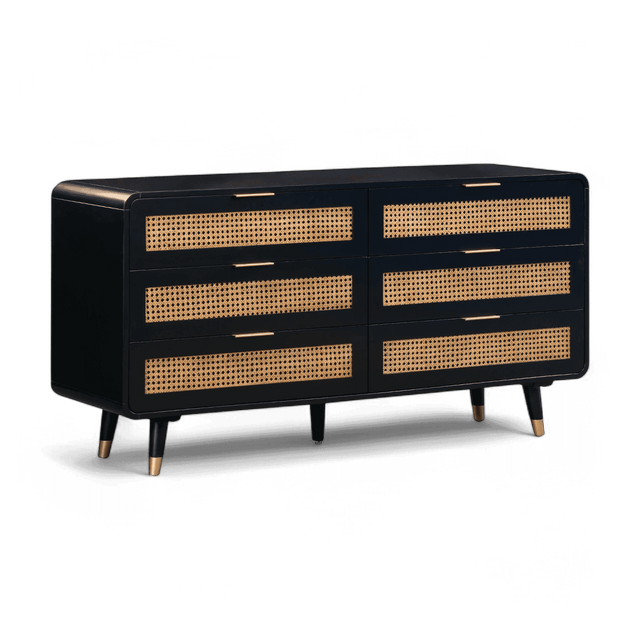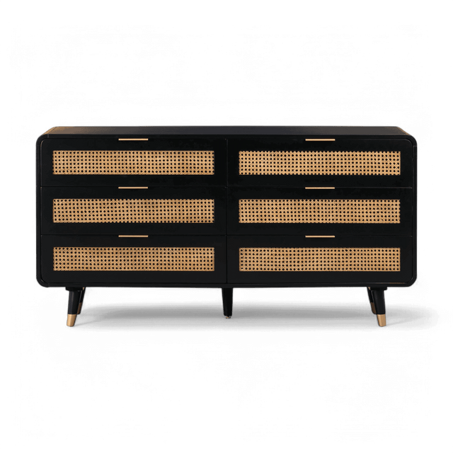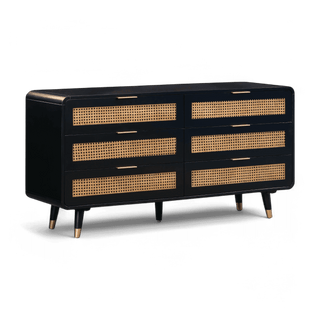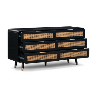 Acacia,MDF,Metal,Natural Cane | Six spacious drawers | Drawer dimensions: 28.9"W x 15"D x 5.1"H | Mid-Century Design