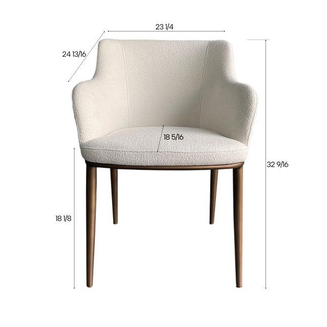 The Jade Dining Chair in White Boucle is a stylish blend of modern elegance and cozy comfort. Upholstered in luxurious white boucle fabric, it offers a soft, textured finish that enhances its inviting appeal. The chair features a rounded back and gently sloped arms, creating a fluid, sophisticated silhouette that complements various dining room aesthetics. The brushed brass-colored legs provide a sleek, metallic contrast, adding a touch of glamour and stability to the design. Perfect for elevating any dining space, the Jade Dining Chair combines timeless style with functional comfort.