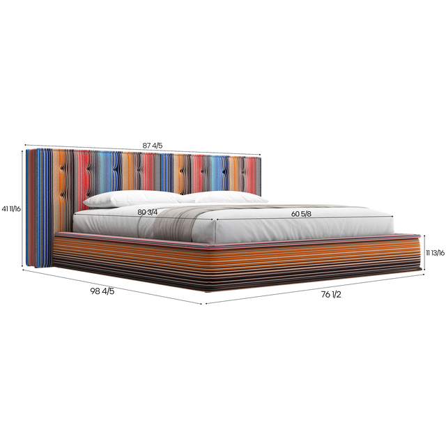 The Maili Bed is a statement piece that brings vibrant, bohemian charm to your bedroom. Its padded headboard and side rails are upholstered in a richly textured, striped fabric featuring a harmonious blend of blues, oranges, reds, and earthy tones. The bold yet balanced color palette evokes a sense of warmth and adventure, perfect for creating a cozy and eclectic space. Designed for both style and comfort, the Maili Bed is as inviting as it is eye-catching, making it the centerpiece of any bedroom.