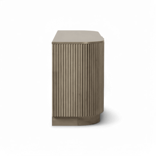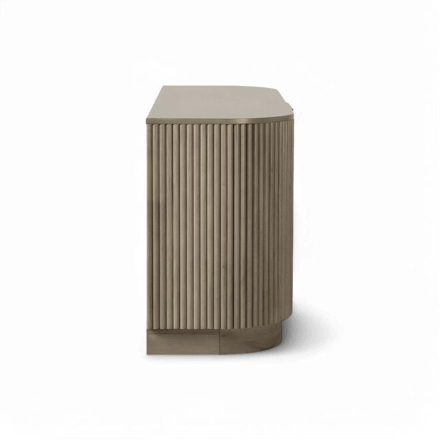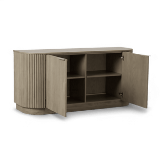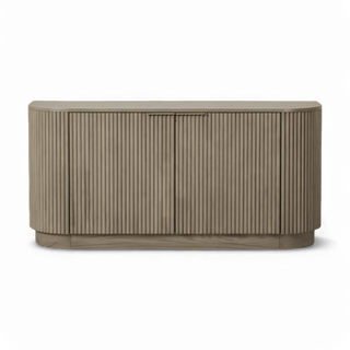 The standout feature is the vertical slat wood detailing on the sides and doors, lending texture and visual interest to its clean, modern lines. With its thoughtful design and versatile aesthetic, the Oxford Buffet Greige Oak is perfect for storing and displaying essentials in dining rooms, living spaces, or entryways.