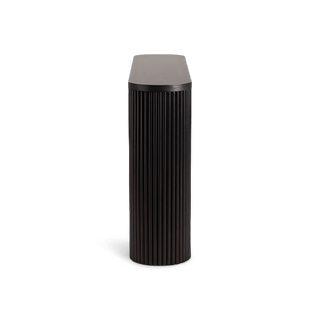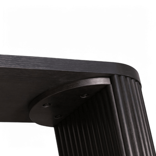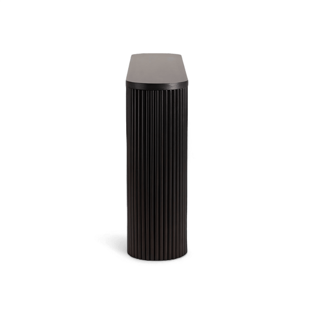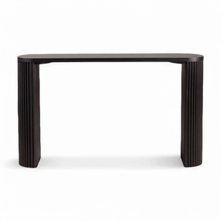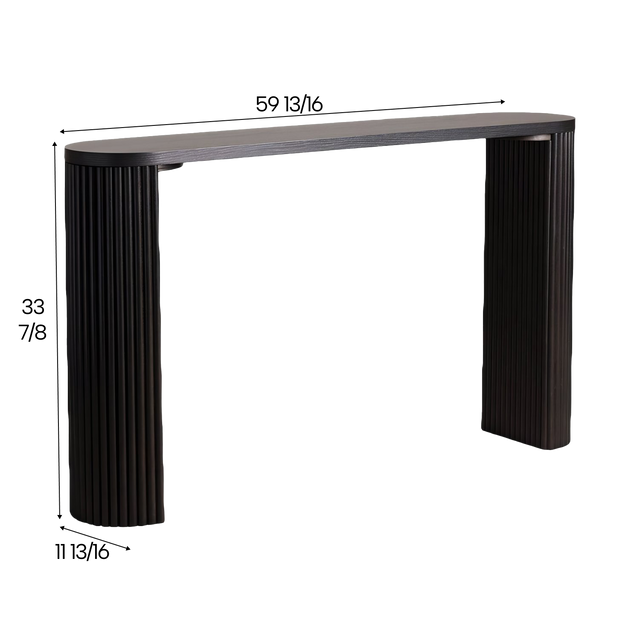 The Oxford Console in Black Wood is a stunning blend of contemporary elegance and unique craftsmanship. Finished in a black oak vinish, this console exudes a sense of understated sophistication. Its top is thoughtfully designed with rounded sides, adding a touch of softness to its overall silhouette. The legs feature an eye-catching semi-circle construction, creating a bold architectural statement. Enhancing the design further is the intricate wood slat detailing on the legs, which adds texture and visual interest.
