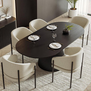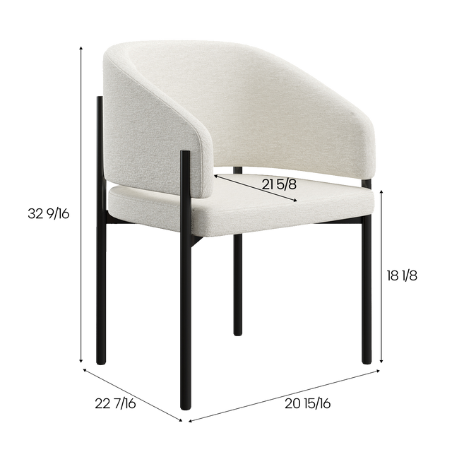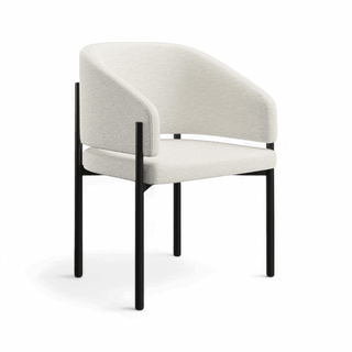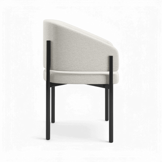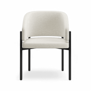 The Oxford Dining Chair features a sleek, modern silhouette with plush off-white fabric upholstery and a slender black metal frame that adds warmth and elegance. Its distinctive curved, enveloping backrest creates a sophisticated yet comfortable dining experience, perfect for contemporary interiors.