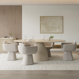 The standout feature of this table is its base design, showcasing an eye-catching arrangement of vertical wood slats that add depth and texture to the overall aesthetic. The combination of the clean, round tabletop and the artistic base creates a harmonious blend of modern and classic design elements, making the Oxford Dining Table Alabaster a stylish and functional choice for your home.