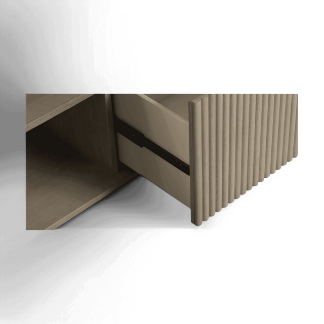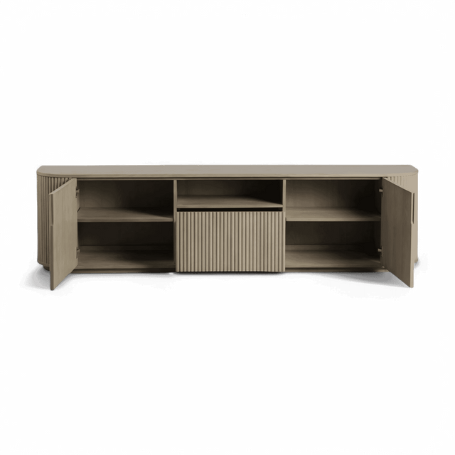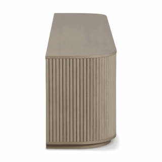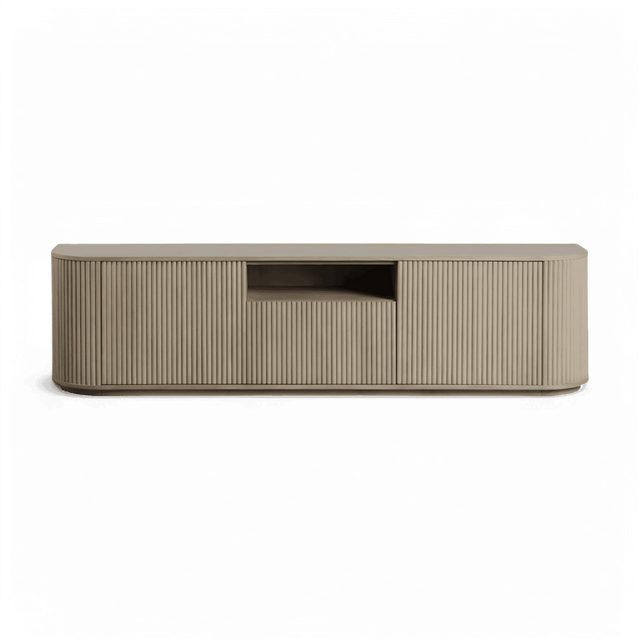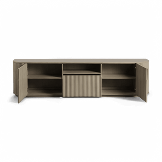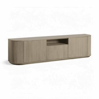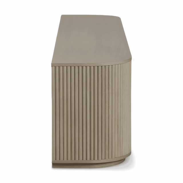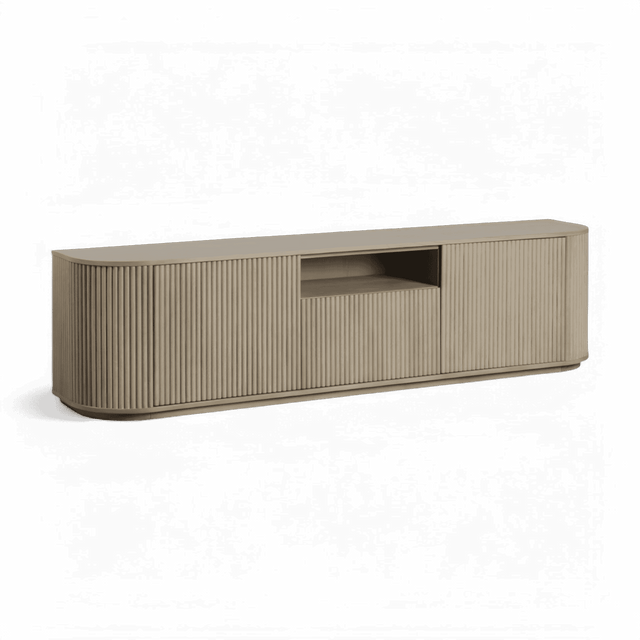 The Oxford TV Stand Greige Oak is a stylish and modern piece of furniture that beautifully combines functionality with contemporary design. Its rounded sides add a soft, inviting touch, while the front panels boast an eye-catching vertical wood slat design, making it a standout addition to any living space.