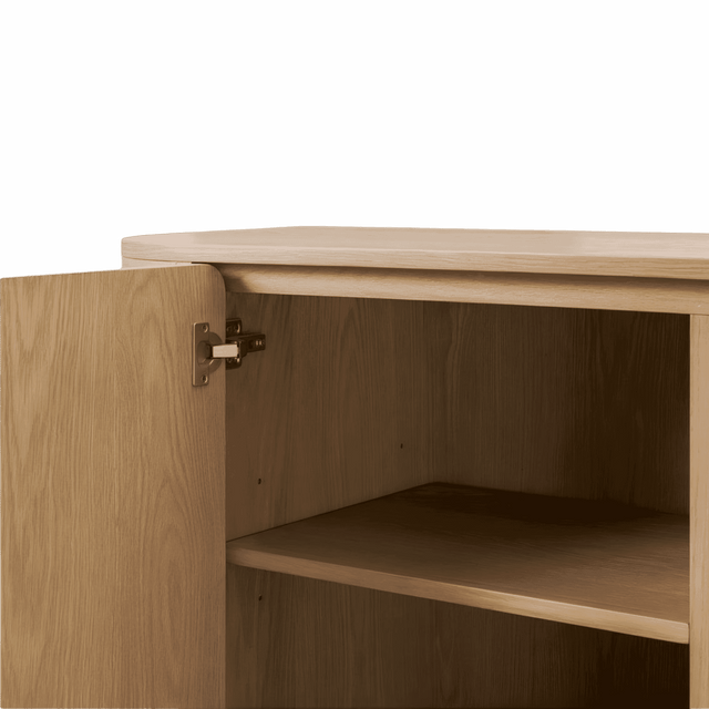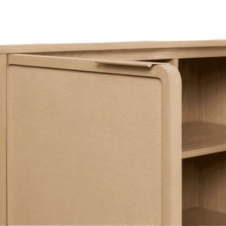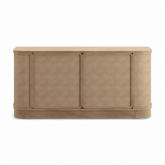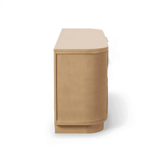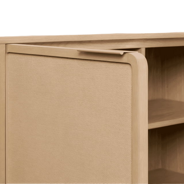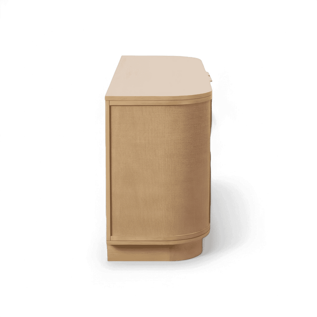 The Windsor Buffet is a perfect blend of elegance and functionality, designed to elevate any space with its sophisticated aesthetic. Crafted with a sleek greige oak veneer, it radiates natural warmth while maintaining a contemporary edge. The doors and sides are beautifully finished with woven cane, adding texture and a touch of organic charm to its design. The curved front sides soften its profile, creating a graceful silhouette that enhances any space.